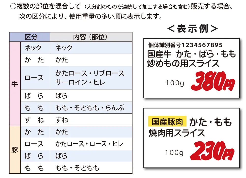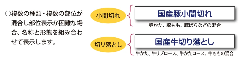 2種類以上の部位を混合した場合は、混合割合の高い順に部位を表示する。