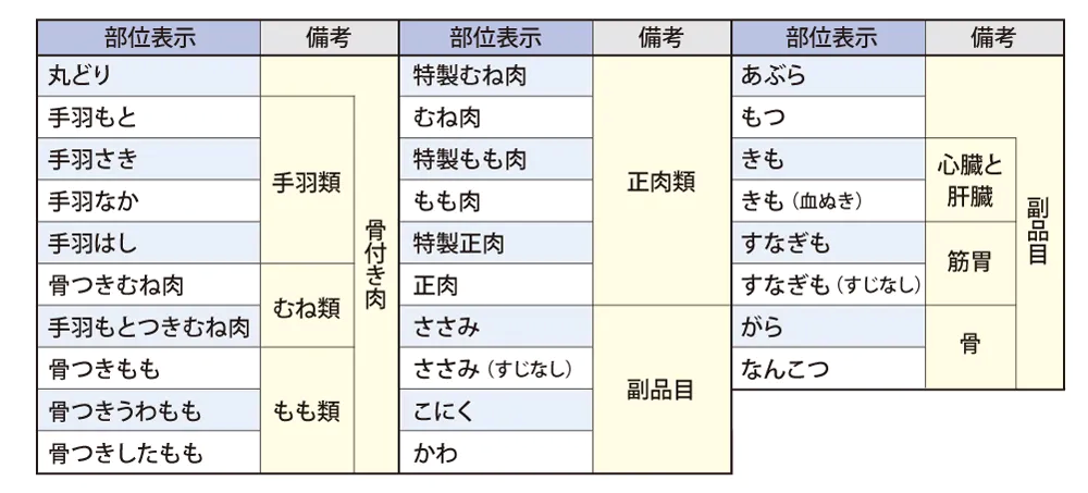 • 鶏肉の部位表示