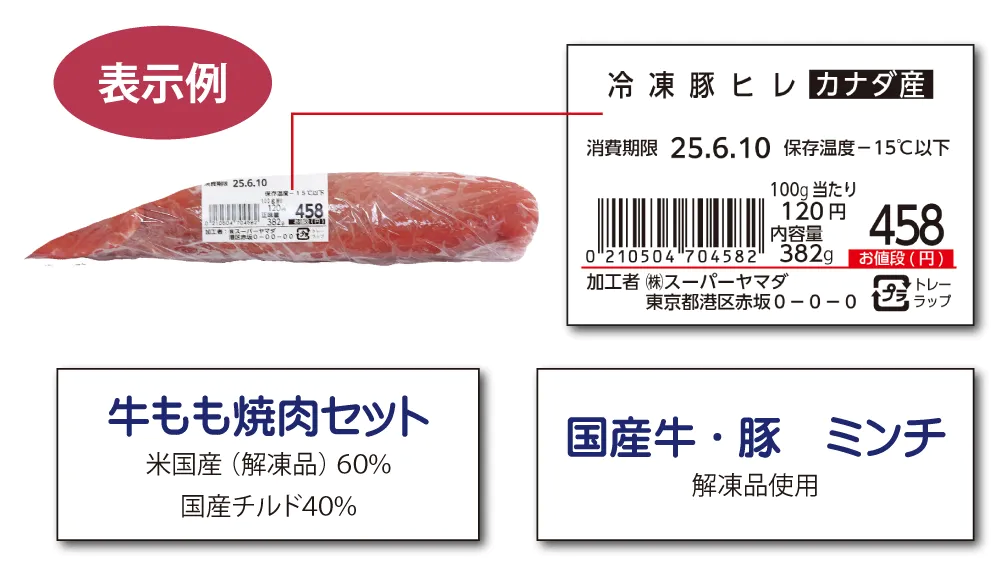 冷凍した食肉を解凍したものには「解凍品」、凍結した牛の食肉は「凍結品」、 解凍した牛は「解凍品」と表示する。