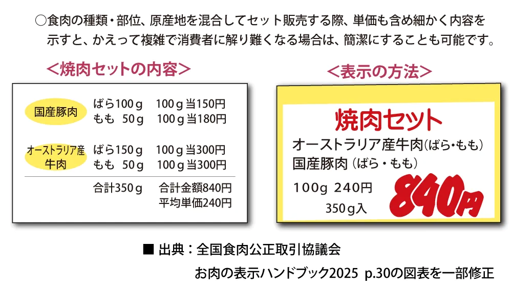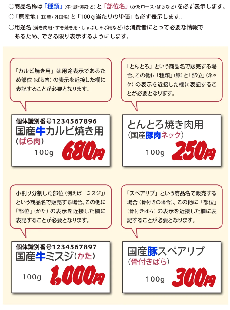 (「ポーク」、「チキン」、「ラム」等の表記も可能)また、「牛かたロース」等と食肉の種類に加えて部位名を表示する。