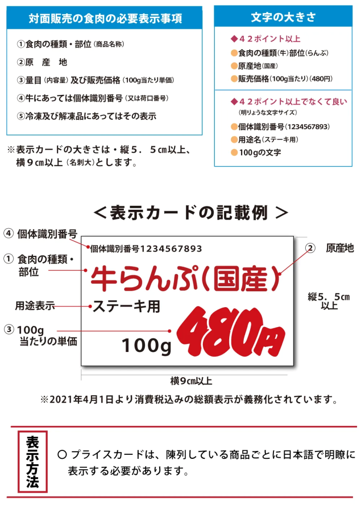 食肉の表示は他の生鮮食品に比べると、「食肉の公正競争規約」があるため、表示しなければならない項目が多いのが特徴である。