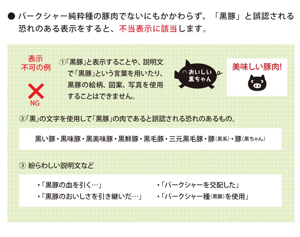 「黒豚」と表示できるのは、「食肉小売品質基準」「和牛等特色ある食材の表示に関するガイドライン」「食肉の表示に関する公正競争規約」によって、「純粋バークシャー種の豚の肉に限る」と定められている。
