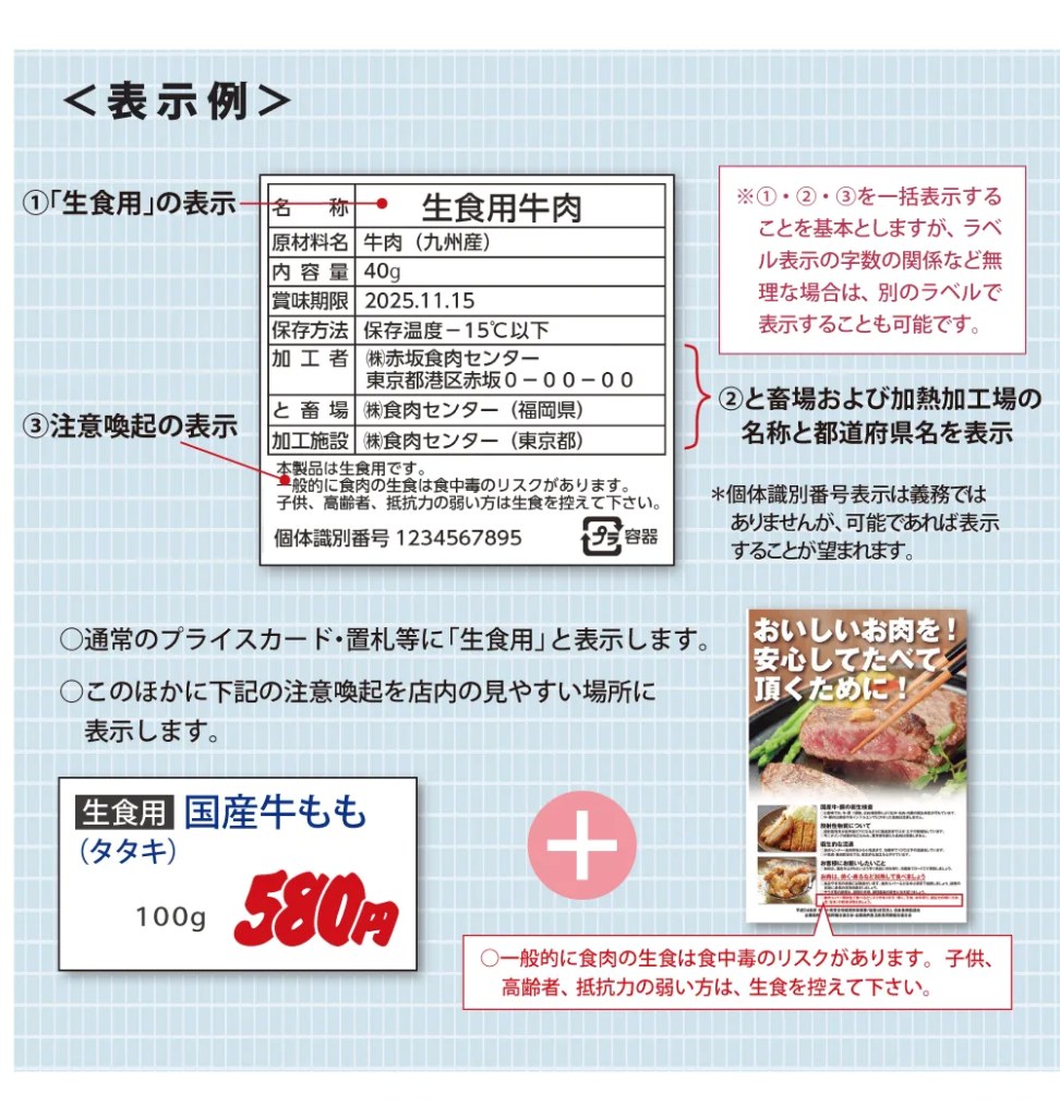 ○パックしたs食肉(個食パック販売など)は、通常の表示の他にプライスラベルに「生食用」と表示する。