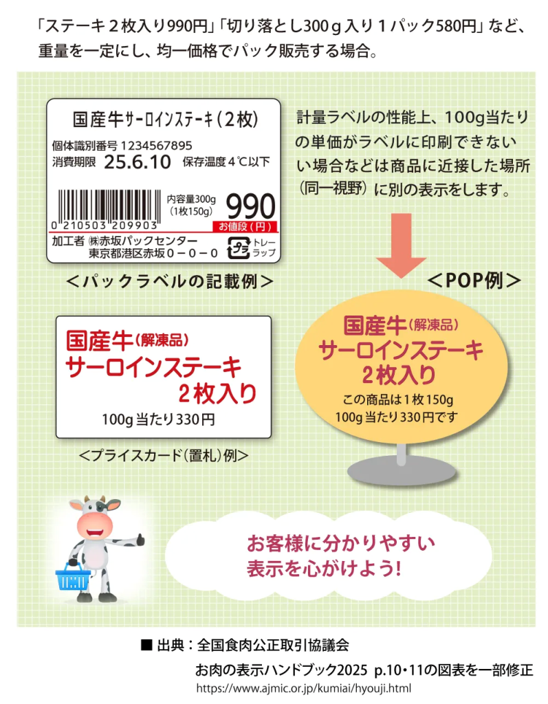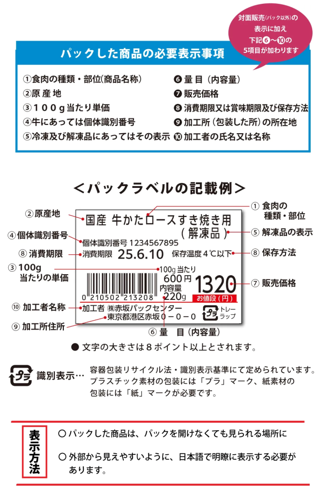 食肉部門の商品の食品表示は、生鮮食品と加工食品で異なり、さらに事前にパックした商品(通常の陳列)とパックせずに量り売りする商品(対面販売)でも内容が異なる。